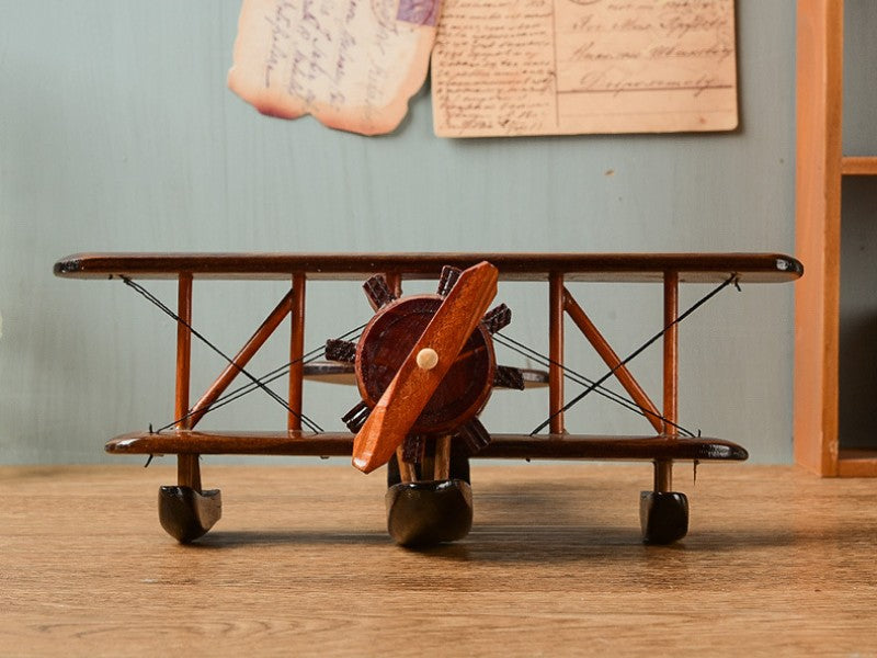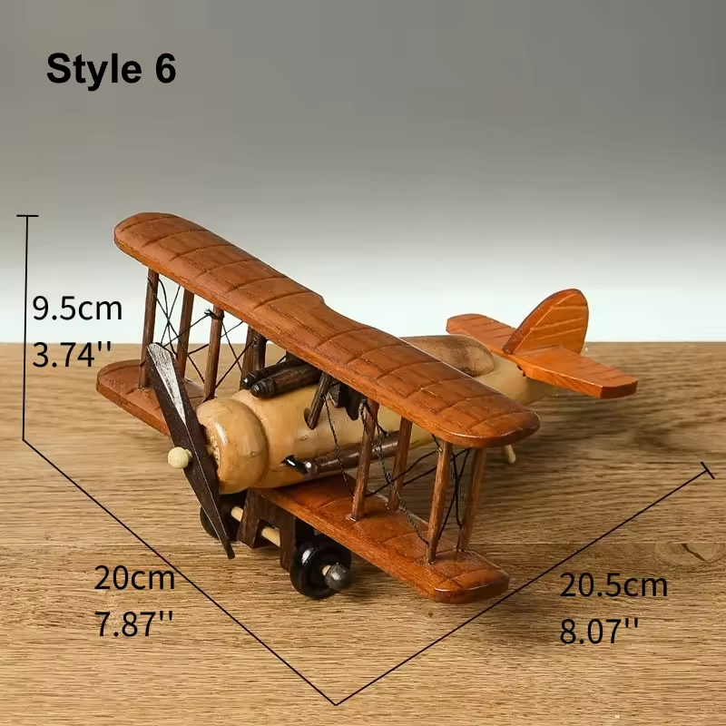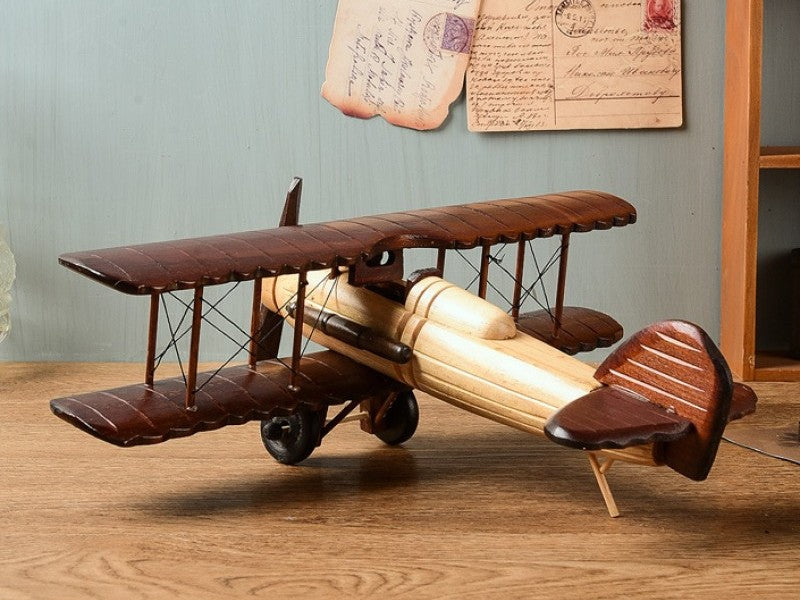 Handcrafted wooden biplane model capturing the charm of vintage aviation. This retro-inspired desktop piece blends nostalgia with contemporary design, making it an ideal accent for collectors, aviation enthusiasts, and those seeking distinctive home décor. The intricate propeller details and natural wood finish reflect quality craftsmanship. A thoughtful gift for anyone who appreciates timeless aesthetics and functional art that sparks conversation.